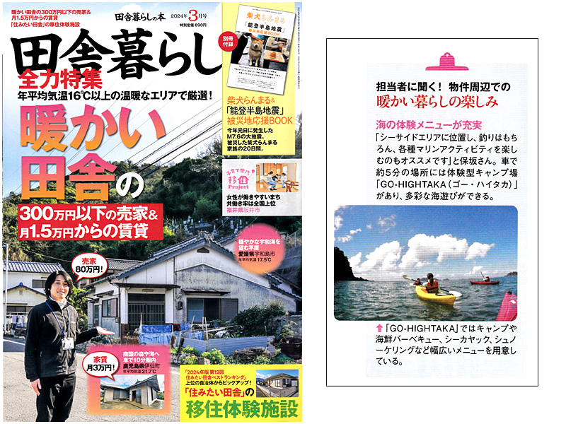 「田舎暮らしの本」3月号の特集に宇和島市蒋渕の物件や周辺環境の記事が掲載されました。「GO-HIGHTAKA」のこともちょっぴり紹介していただいてます。